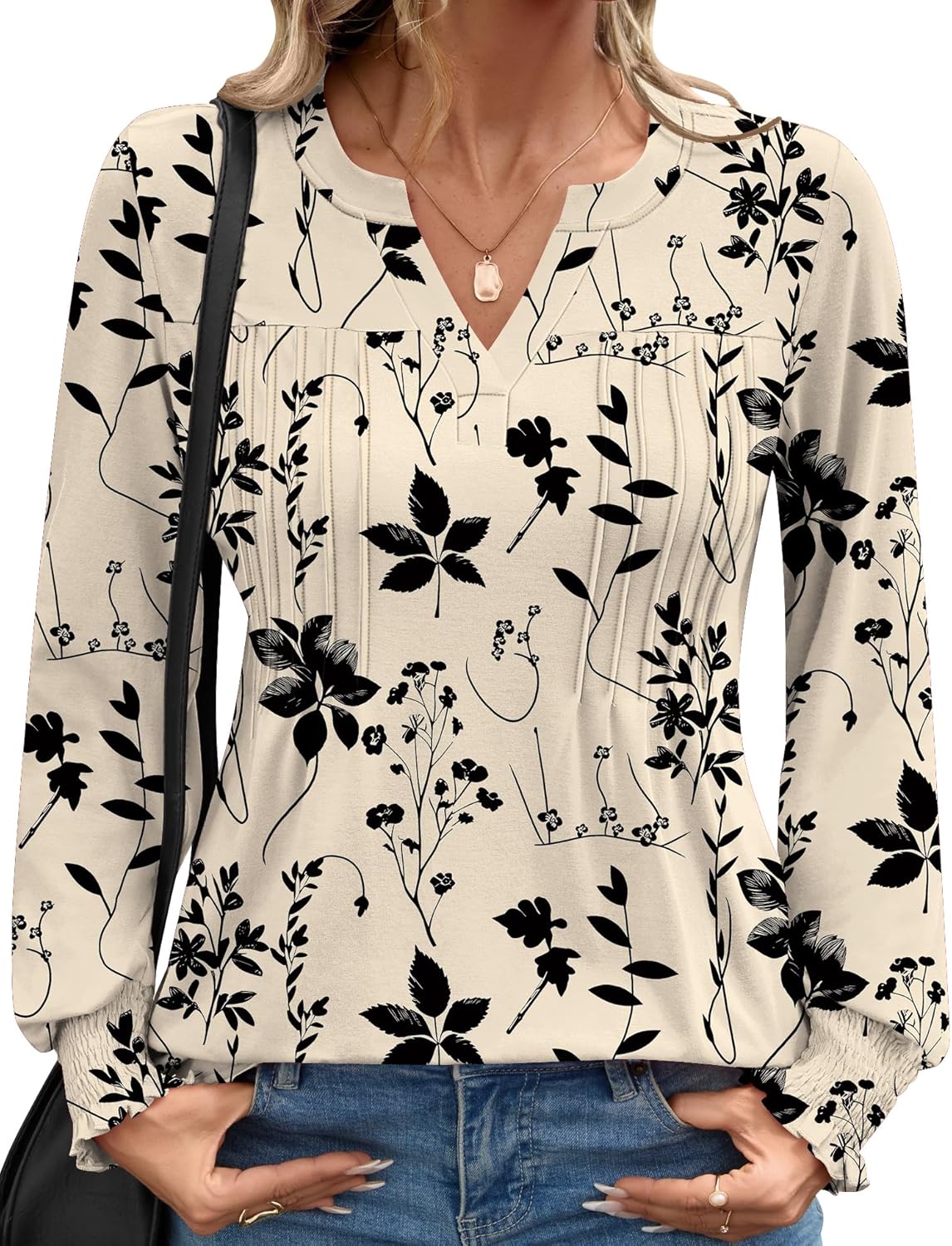 Ivicoer Long Sleeve Shirts for Women V Neck Pleated Blouses for Women Dressy Casual Fall Ladies Top 2025