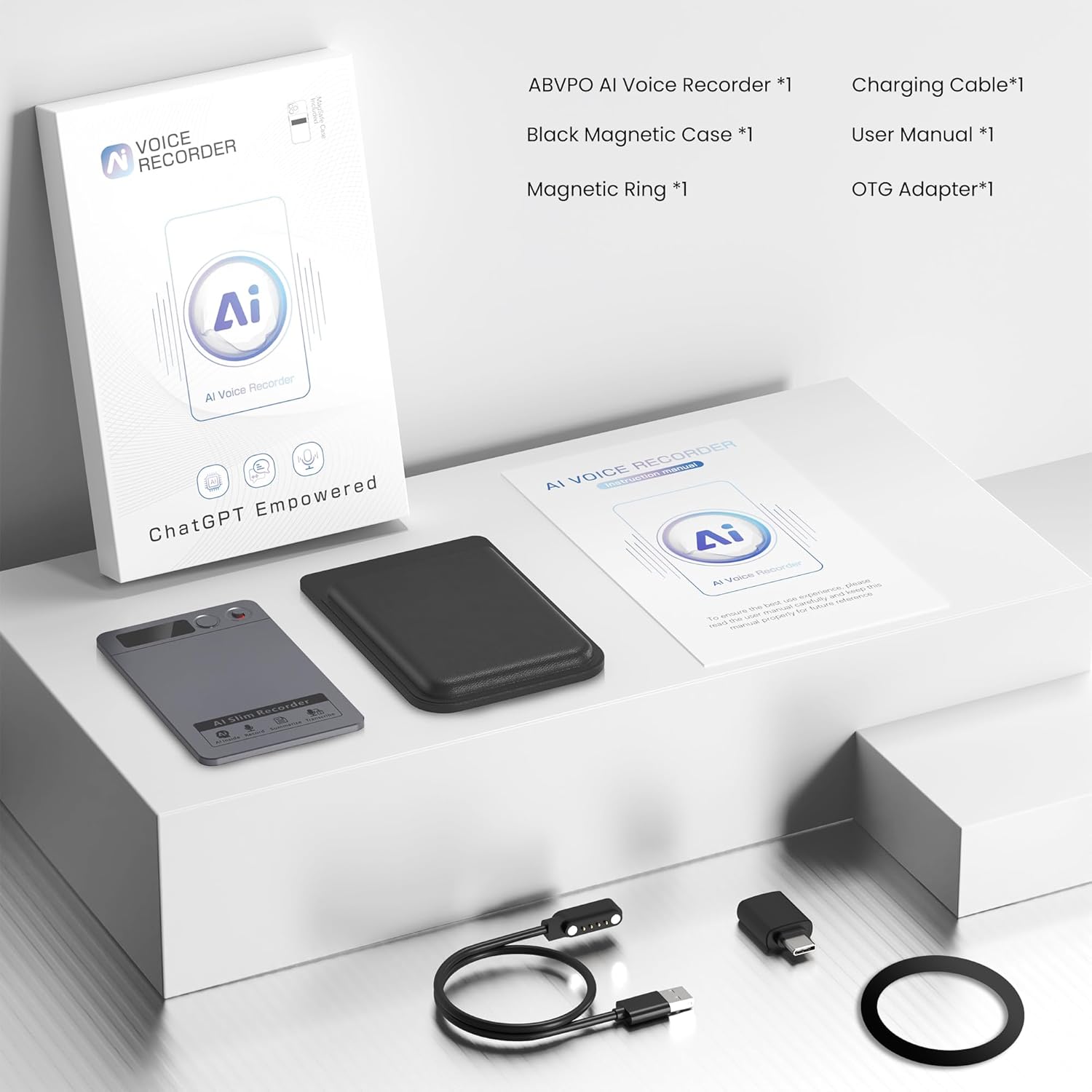 The ABVPO AI Voice Recorder comes with everything you need to get started, including the device itself, a black case, metal ring, and magnetic charging cable. This comprehensive solution ensures that users have a complete voice recorder system, ready to use right out of the box. With its sleek design and user-friendly interface, the device is easy to navigate, making it accessible to users of all skill levels.