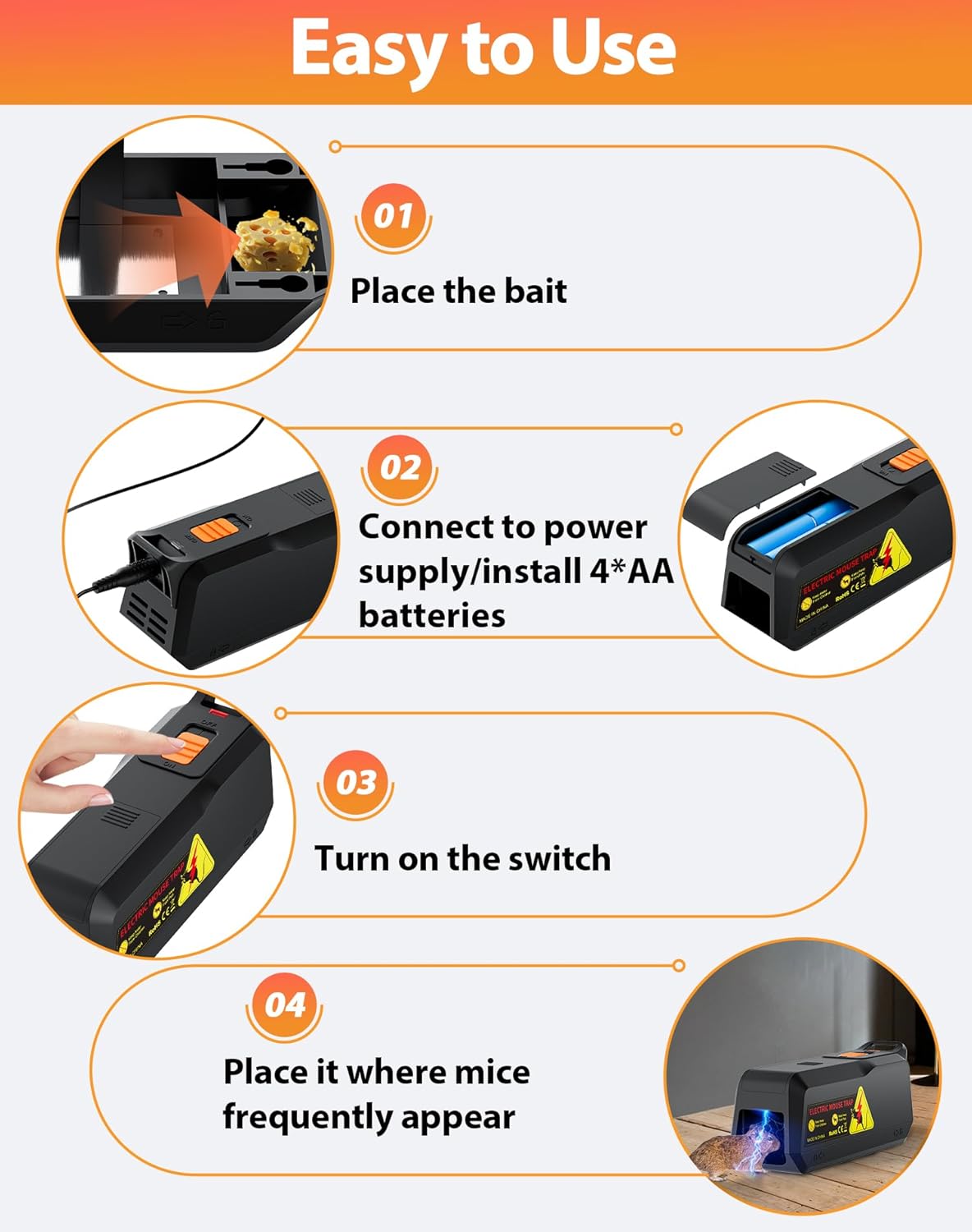 The trap offers flexibility in terms of power supply, allowing users to choose between battery operation with 4*AA batteries (not included) for cordless convenience or using the included USB cable for continuous operation. This flexibility makes the trap suitable for various locations, including kitchens, garages, and areas where access to a power outlet might be limited. The ability to switch between power sources ensures reliable rodent control without the constraint of needing a nearby outlet.